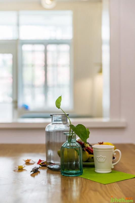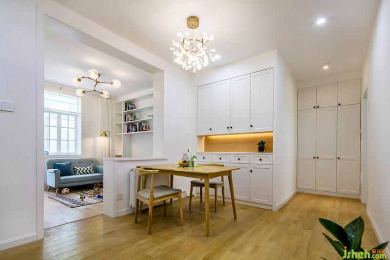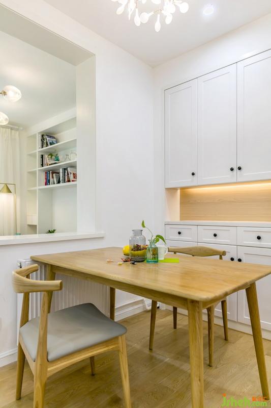 餐廳拆除了原建筑的門連窗,與起居室做了一個相呼應(yīng)的就餐環(huán)境,相當(dāng)于一個小吧臺恰如其好的銜接客餐廳的空間,與客廳風(fēng)格相同,原木色的餐桌椅搭配一組白色的餐邊柜,螢火蟲的吊燈在空間中相映成趣。