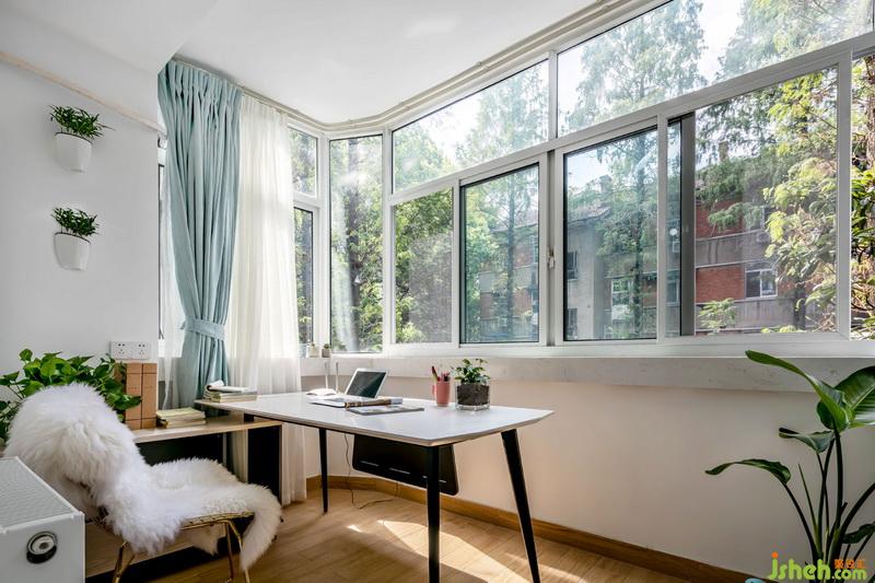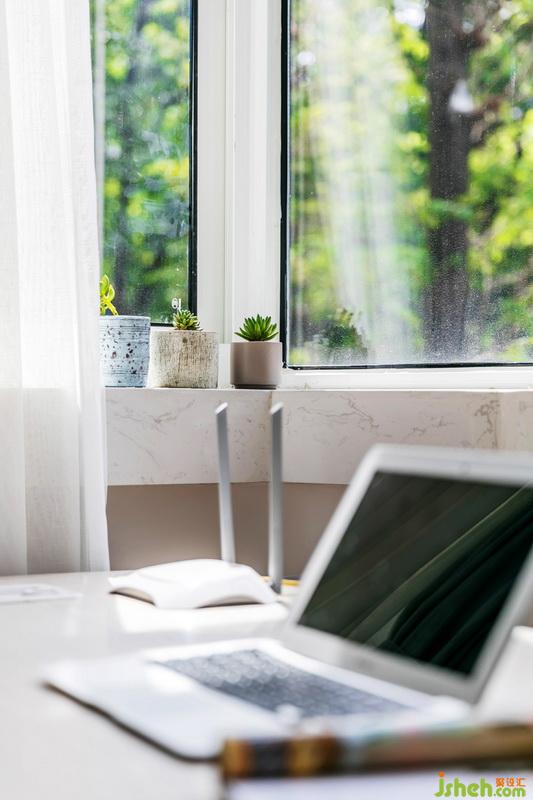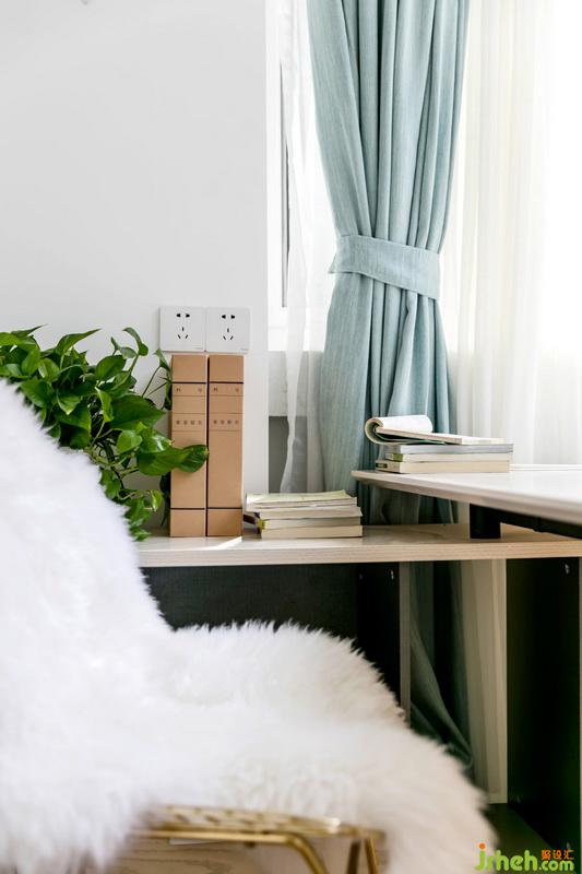 室內(nèi)設(shè)計(jì)師在主臥陽臺主要改造成王老師的工作區(qū),一張簡易的寫字桌搭配一把金色的貝爾托亞單人椅,整個(gè)空間通透明朗,無論春夏秋冬,無論辦公休憩,這個(gè)空間都是最好的去處,用我最喜歡的一句話,陽光為房間開了燈,更為適合不過了吧。