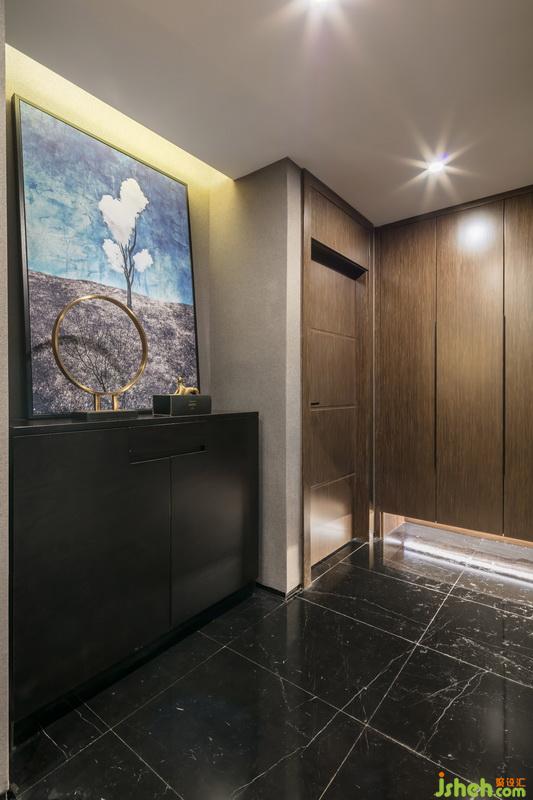 室內(nèi)設(shè)計(jì)師在設(shè)計(jì)手法上,門廳的地面使用了黑白根的石材,一是為了空間風(fēng)格的定調(diào),二是便于門廳區(qū)域的清潔;右手邊的鞋柜也是做了離地鏤空處理,顯得并不是太滿,同時(shí)又很方便出入換鞋,臥室門使用非標(biāo)定制到頂處理,與柜體面保持一致,與頂面橫平豎直,讓空間干凈利索,整潔統(tǒng)一。