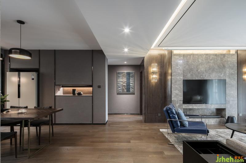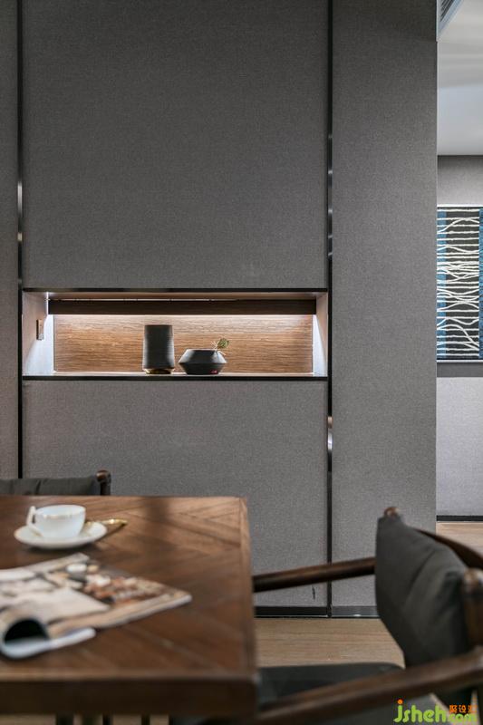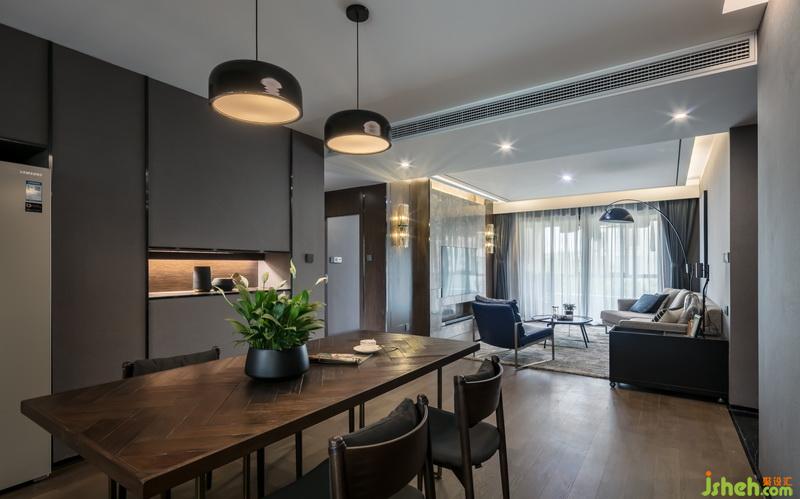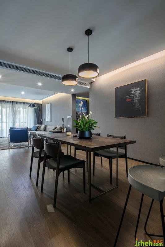 室內(nèi)設(shè)計(jì)師將客餐廳硬裝以紳士灰作為主色調(diào),沉穩(wěn),溫和,又不失時(shí)尚優(yōu)雅。軟裝上面采用黑白灰的過(guò)渡,點(diǎn)綴胡桃木色,增加了溫度;配以黑色霧面與鏡面不銹鋼,拉升了整體空間的品質(zhì)感。