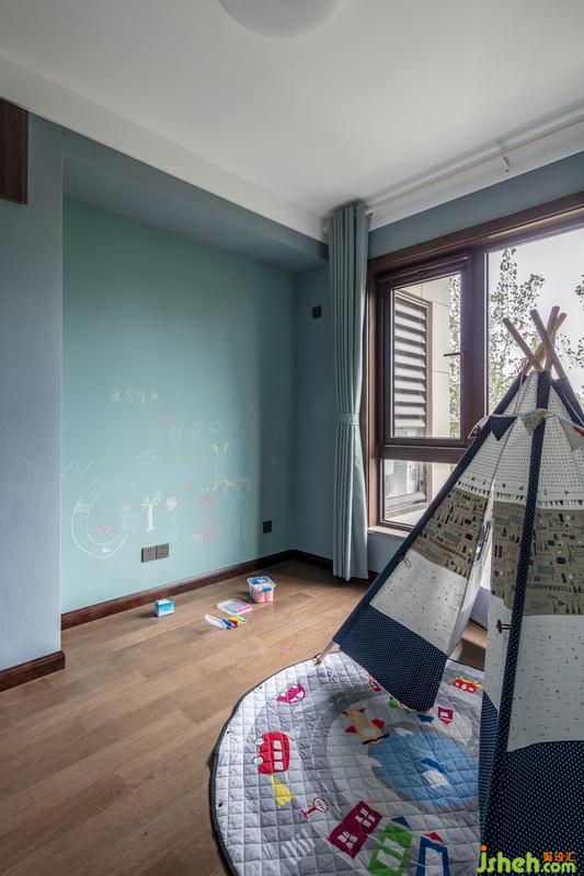 兒童娛樂室,孩子的世界里,永遠(yuǎn)是豐富多彩的。設(shè)計(jì)考慮到業(yè)主家的孩子正在成長階段,涂刷一面有色繪圖墻,留給孩子隨意圖畫。