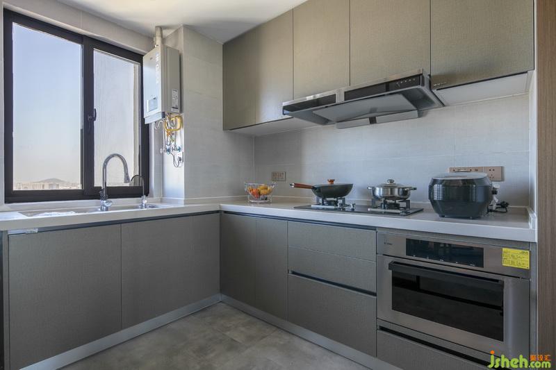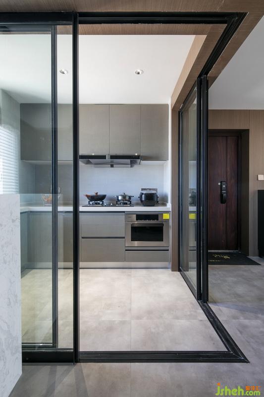 餐廳與廚房色調(diào)延續(xù)了客廳的灰調(diào)色系,使得空間調(diào)性保持一致。餐廳與廚房我們做成社交廚房的概念,利用玻璃軌道門,讓廚房開合與封閉隨時(shí)可變化;餐廳,中島,廚房三點(diǎn)一線,可根據(jù)不同功能做出不同場(chǎng)景使用。