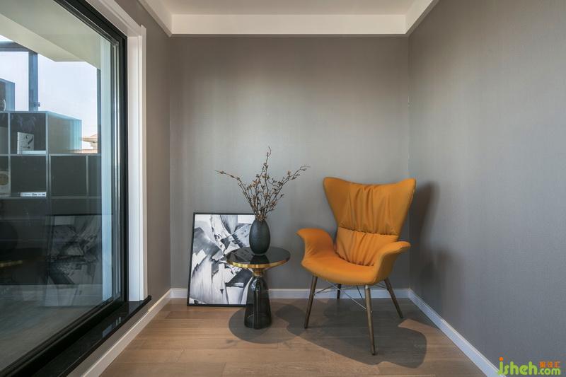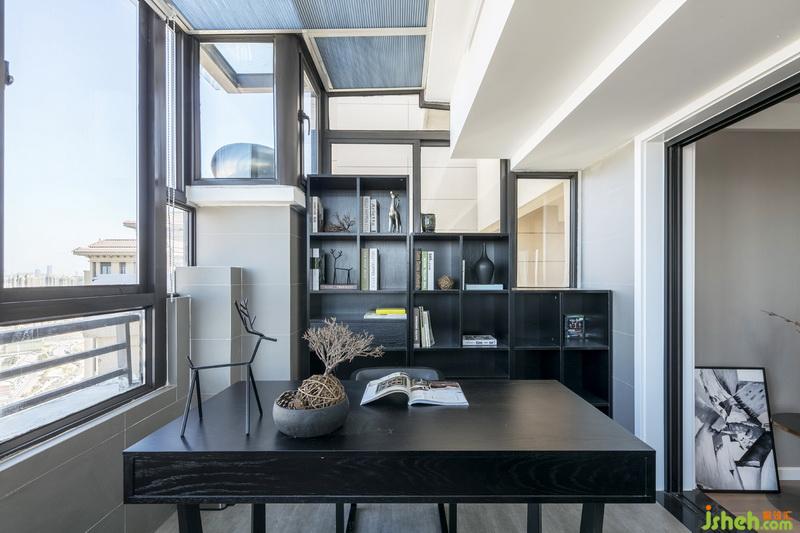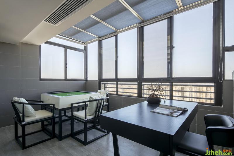 室內(nèi)設(shè)計(jì)師在陽(yáng)光房整體色系同樣延續(xù)了黑白灰的格調(diào),灰色的磚面,深色系的家私,加上大面積的采光,使得空間對(duì)比鮮明,看上去精致時(shí)尚。