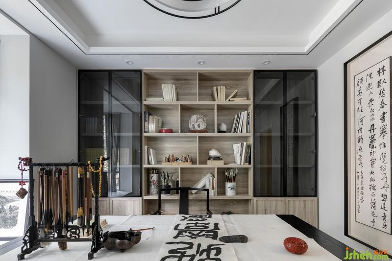 氣韻為主,筆墨為先”。書房以墨色直線條為主要造型手段,圍合出書畫場(chǎng)域,書法桌可盡情揮毫;虛實(shí)相容,不即不離,重在傳神達(dá)情,創(chuàng)造當(dāng)下的書寫藝術(shù)空間。