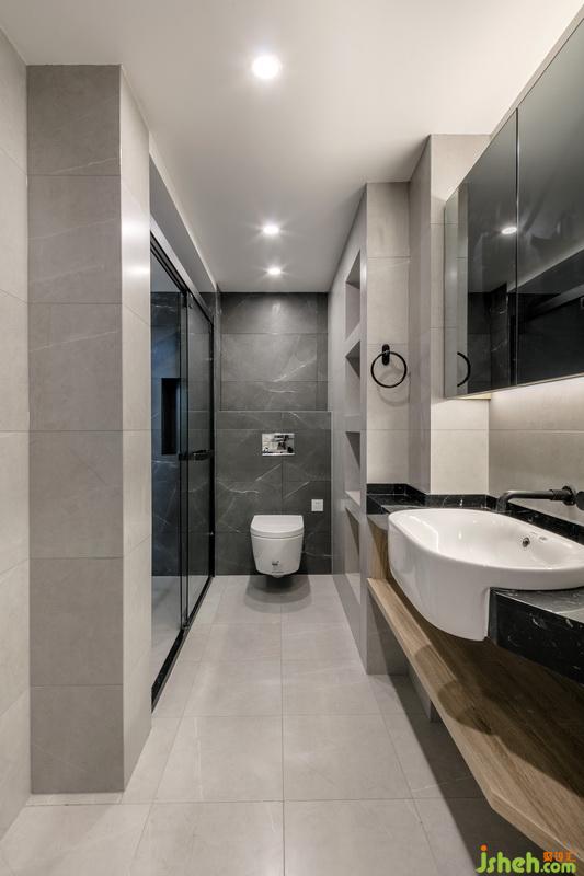 衛(wèi)生間經(jīng)平面改造,采用就近收納原則,用灰色和黑色的磚以及黑色大理石拉開空間的對(duì)比度,高級(jí)卻不是雅致。
