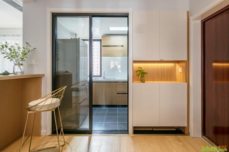 入戶利用廚房的空間做了一組入墻式分體鞋柜,方便進(jìn)門后置放鑰匙等物件,局部留空加入燈帶,增添入戶光線與層次。