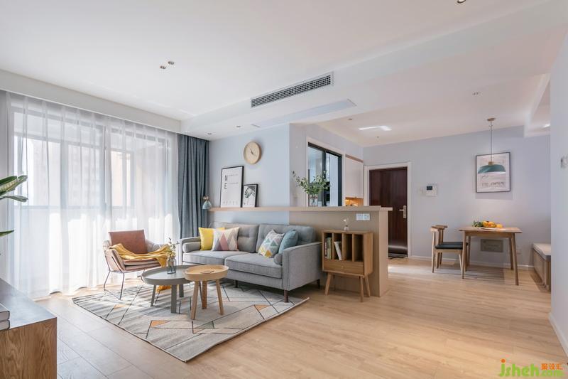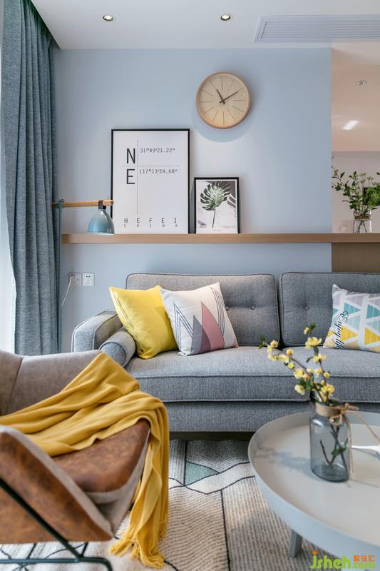 客廳跳色軟裝增添活潑氛圍,落地玻璃式陽(yáng)臺(tái)賦予空間充足的光線。