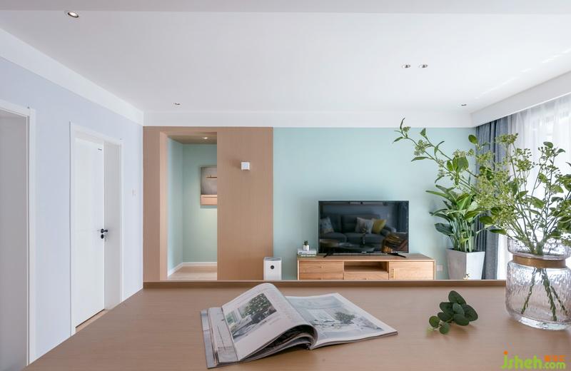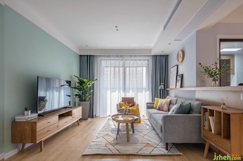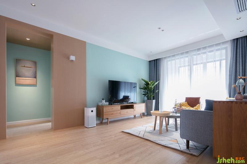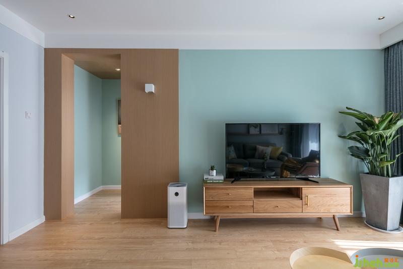 室內(nèi)設(shè)計(jì)師選用綠色系電視背景墻,搭配木色電視柜與側(cè)面走廊設(shè)計(jì)相呼應(yīng),大盆綠植給空間增添生機(jī)