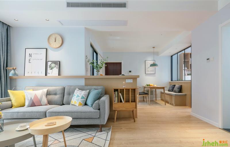 室內(nèi)設(shè)計(jì)師使用木色吧臺(tái)延伸至灰藍(lán)色乳膠漆立面,點(diǎn)綴大小簡(jiǎn)框畫與掛鐘,呈現(xiàn)清新文藝格調(diào)。