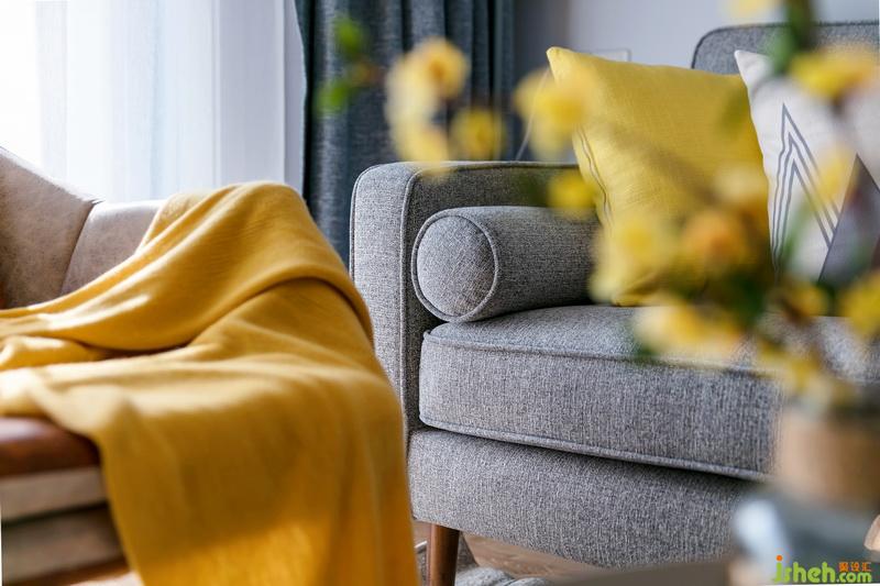 客廳小景,明亮黃色的搭毯與花藝給客廳增加活潑、年輕的氛圍。