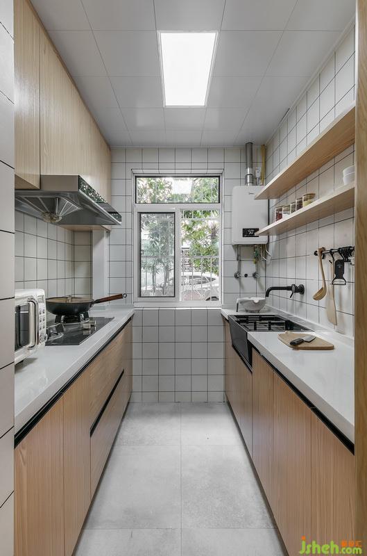 室內設計師改造后的廚房重新規(guī)劃了廚房洗切燒的黃金位置, 增加吊柜來增加小空間的收納,將油煙機藏進吊柜中,小空間中線條保持一致,干凈利落、井然有序。