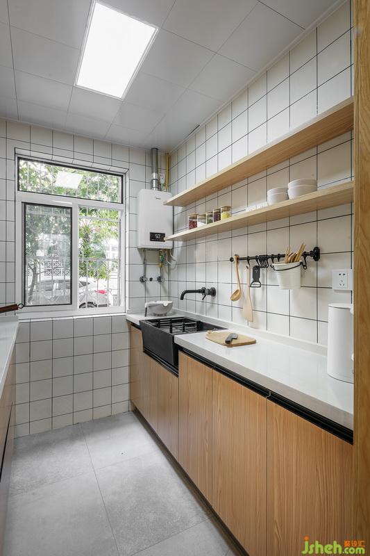 為了增大廚房的活動空間,我們做了40公分的操作臺面內嵌水槽,開放式的層板置放的碟碗調味品方便拿取,墻面的掛鉤也能滿足日常的小件收納,收納分類好,再小的廚房也能安排的井井有條。