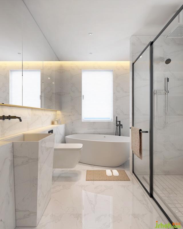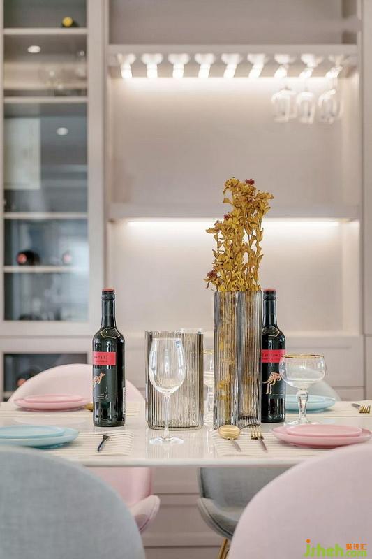 室內(nèi)設(shè)計師在主衛(wèi)的門做了窄邊黑色金屬框,同時延續(xù)的門廳的藝術(shù)玻璃,墻面做了一整面酒柜,看上去簡潔大氣,同時又兼具充足收納。