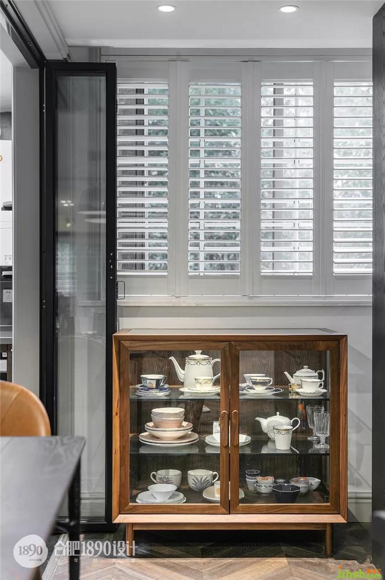 黑胡桃玻璃餐邊柜精品柜,展示羅列了屋主平時(shí)的收藏,豐富了拐角的空間,同時(shí)又提升了整體空間的品味。