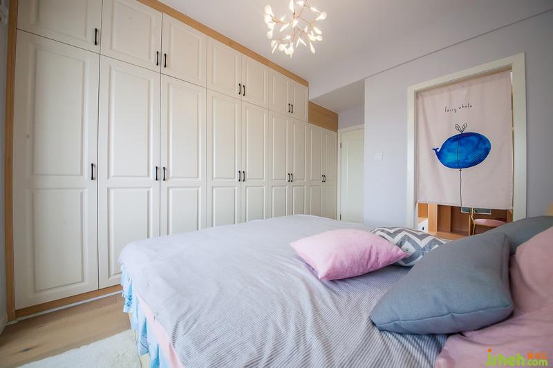 主臥與兒童房一整面墻的柜體滿足業(yè)主生活儲存需要,而白色與原木色的淺色系柜面又不會讓空間壓抑。