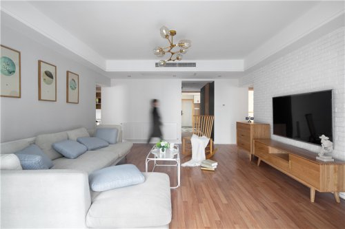 淡水藍色的電視背景墻與同色布藝沙發(fā),如水波微微蕩漾,在這個空間里流淌著。黑白幾何圖形地毯與咖啡色窗簾,則為這個家平添幾分年輕時尚。喵星人在慵懶地伸展著身體,時光慢行,一切正好。