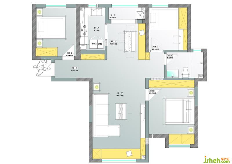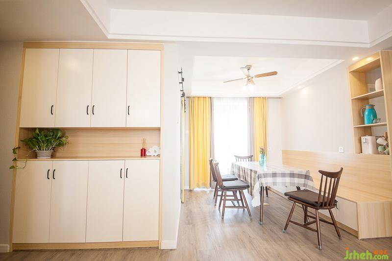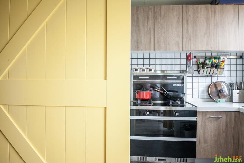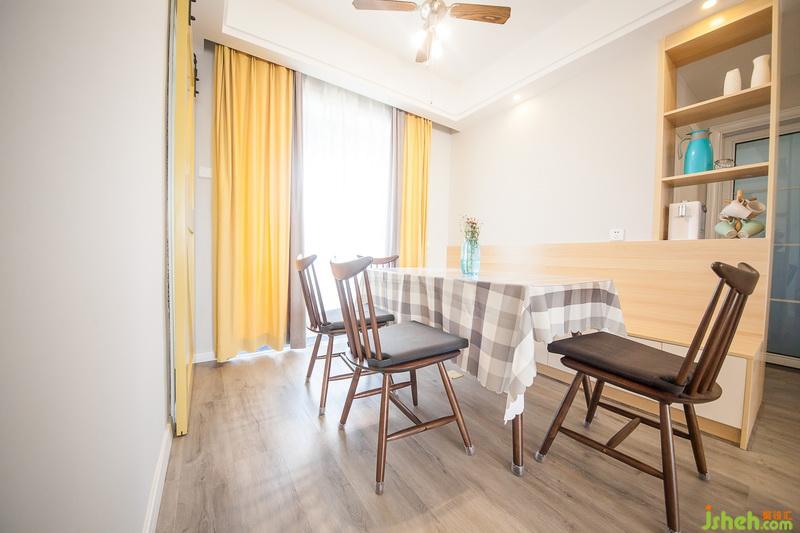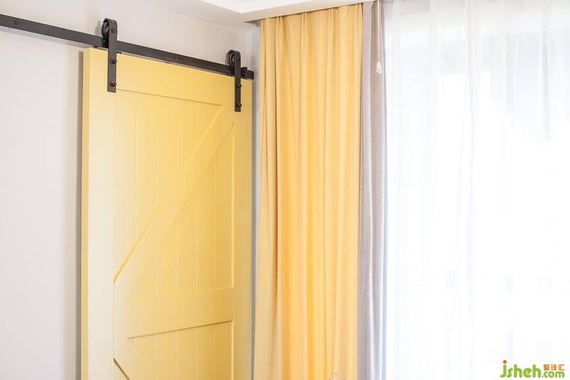 室內(nèi)設(shè)計師將餐廳的窗簾與客廳陽臺呼應(yīng),也選用灰色與黃色拼接的窗簾,搭配廚房黃色的谷倉門,簡單而又熱情的,喚醒著每個清晨。