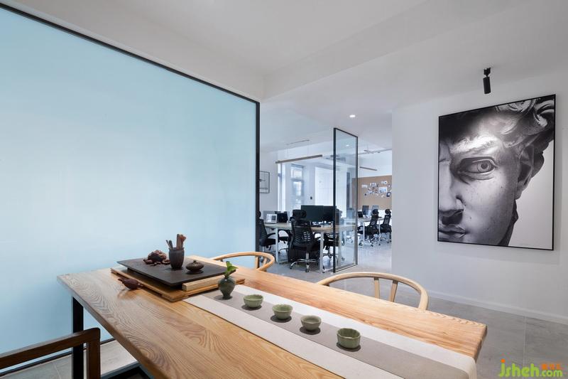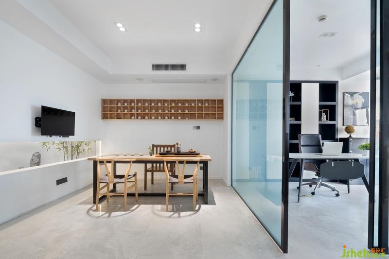 我們用可調(diào)控的霧化玻璃圍造了獨(dú)立的辦公空間,日常時(shí)調(diào)為可視狀態(tài),將自然光線引入品茶室。需要的時(shí)候調(diào)為不可視狀態(tài),方便洽談。