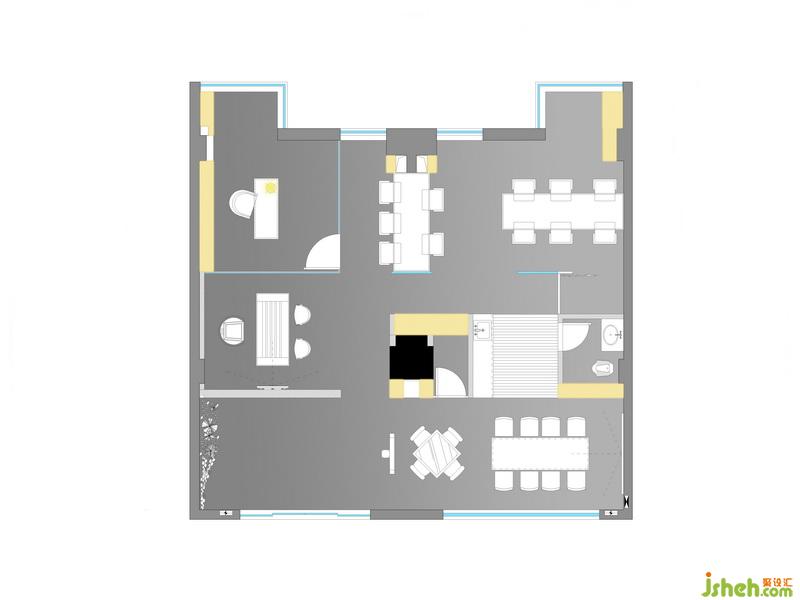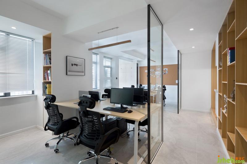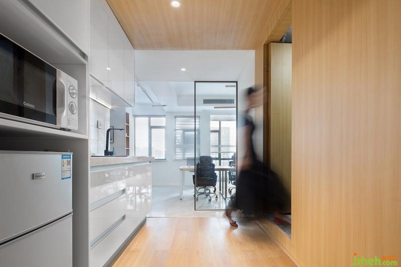 辦公區(qū)與會(huì)客區(qū)之間做一個(gè)抬高,作為水吧臺(tái),賦予它生活功能。