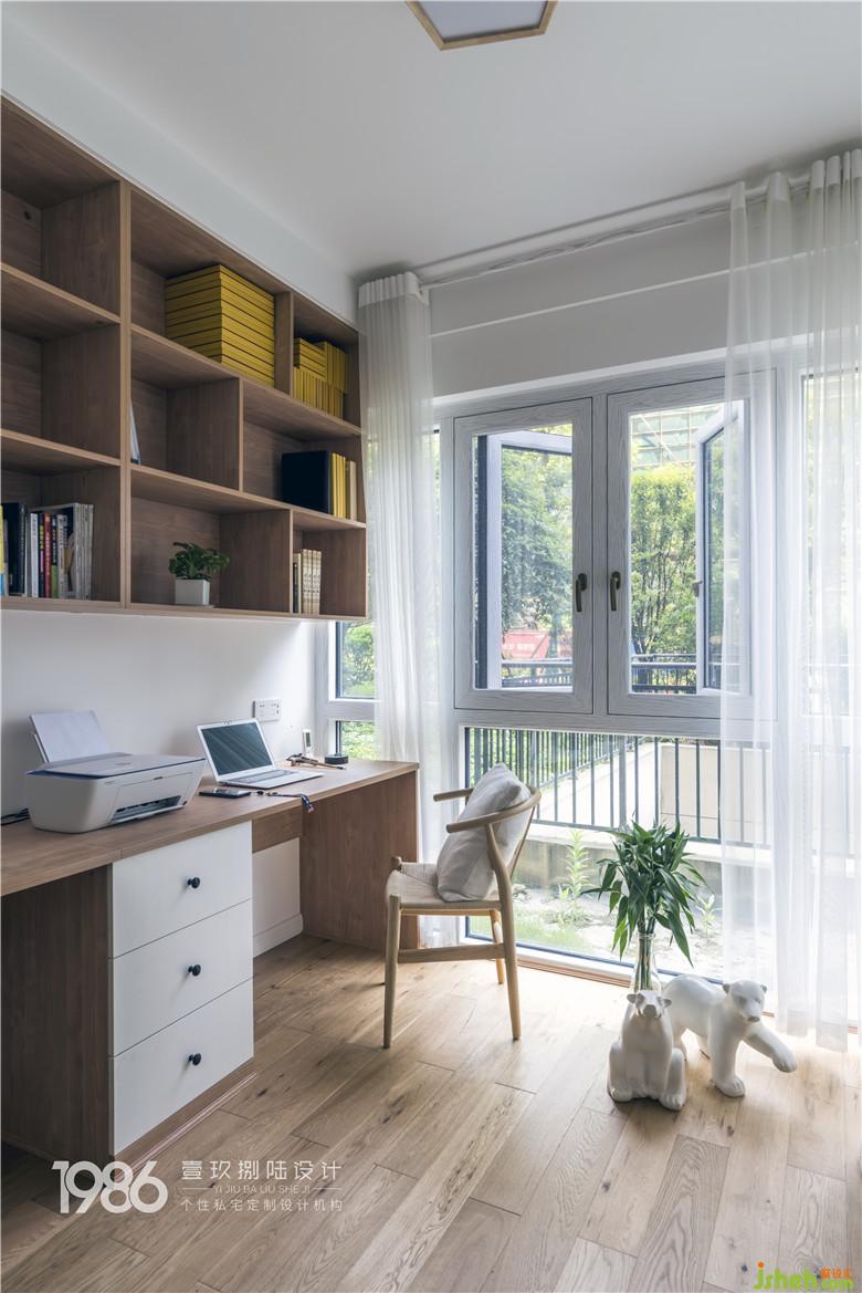 書(shū)房在布局時(shí)便將它與臥房區(qū)域分隔開(kāi)來(lái),在玄關(guān)旁邊遠(yuǎn)離需要安靜的睡眠區(qū)域,在這里主人可以安心學(xué)習(xí)和工作。為了讓兩位主人學(xué)習(xí)工作時(shí)不沖突,室內(nèi)設(shè)計(jì)師給書(shū)房設(shè)計(jì)了兩人位的書(shū)桌。