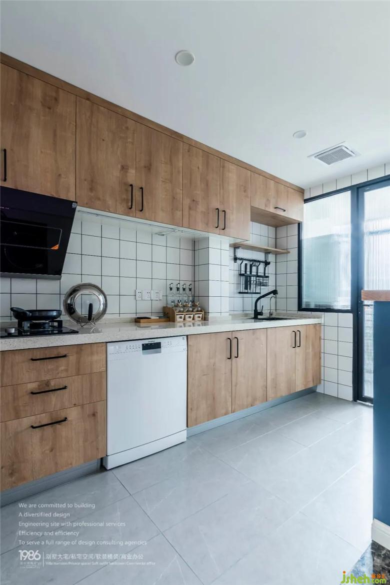 廚房裝修公司通過傳統(tǒng)北歐面包磚的形式來增加廚房墻面的層次的跳躍感,配上原木色的整體櫥柜,使整個廚房空間更加的明亮起來。