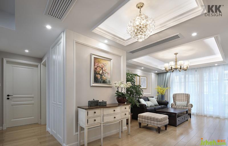 從玄關看客廳,整體白色搭配藍色窗簾給這個夏天增添一抹清爽的感覺。美式風格線條感干凈利落,使空間感干凈明亮。