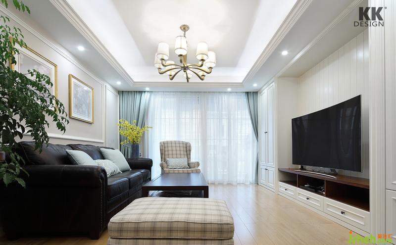 客廳區(qū)域電視背景墻做了大量的儲藏柜體設計,整體美觀實用。