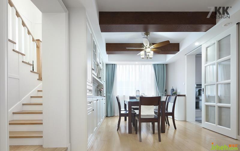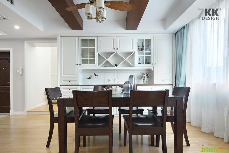 餐廳深色木質(zhì)的餐桌椅,吊頂也是用木條裝飾,個性的吊燈和風扇搭配,也成了一道獨特的風景。桌邊的餐邊柜既是裝飾柜又是比較實用的收納柜。