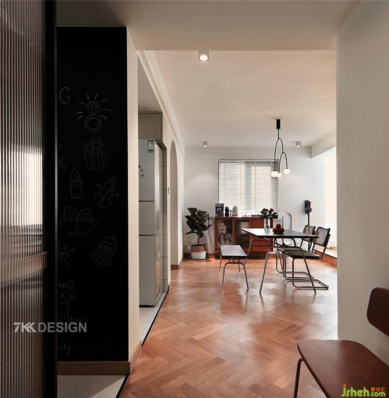 衛(wèi)生間做了三分離設(shè)計(jì),大面積使用白色,讓采光欠缺的衛(wèi)生間更加開闊明亮。洗手臺(tái)外置,透明玻璃移門將淋浴區(qū)與干區(qū)做分割,隔絕水汽不隔絕陽光。衛(wèi)生間過道一側(cè),黑板墻設(shè)計(jì)。方便業(yè)主二人寫寫畫畫,規(guī)劃生活計(jì)劃,還可以給彼此之間制造小驚喜。
