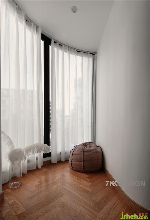 原始陽臺(tái)是室外的,現(xiàn)在納入室內(nèi)使用作為休閑區(qū)域,白色的窗紗透光輕盈,墻邊也是弧形,使得空間更加柔和。