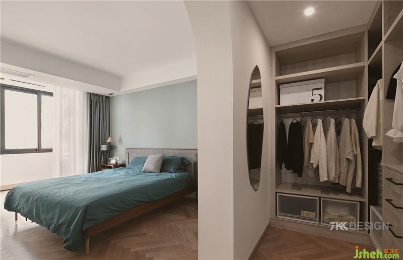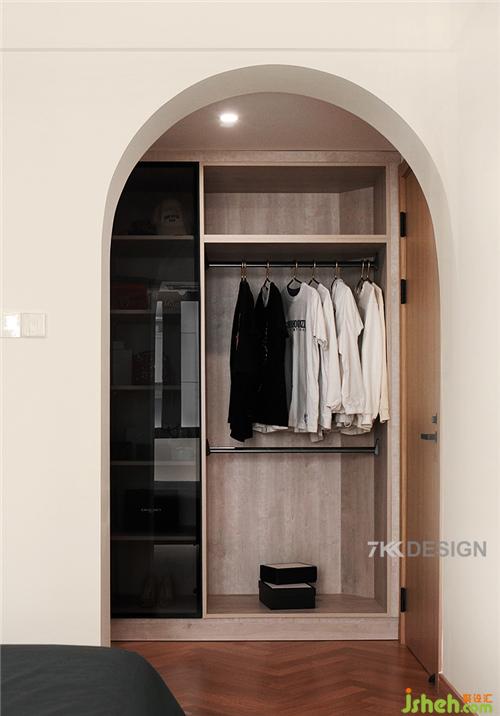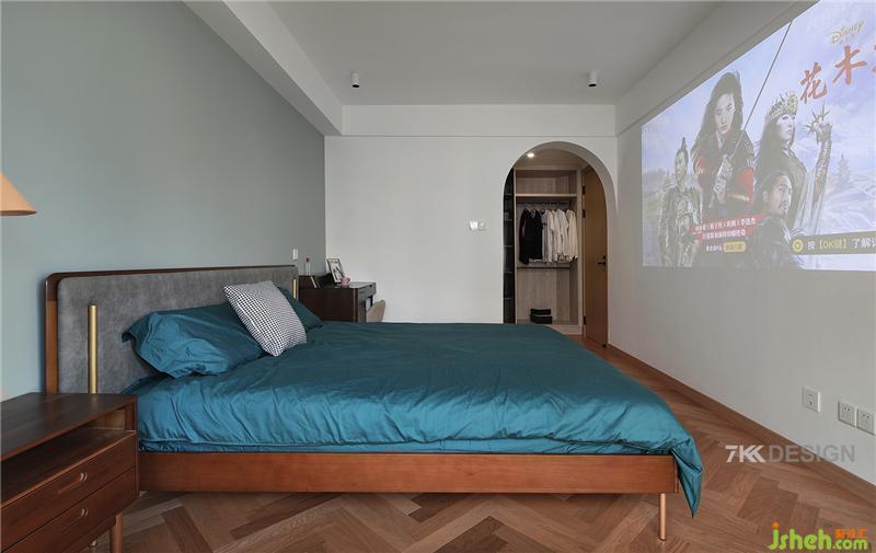主臥形成套房模式滿足女業(yè)主的衣帽間,衣帽間和主臥休息區(qū)開放式設(shè)計(jì),把原始主臥門改成拱形門洞的效果與外面的拱形門相呼應(yīng),增加主臥的趣味性。 主臥沒有選擇電視,采用投影儀,一面白色墻面就可以打開空間震撼的視覺效果。