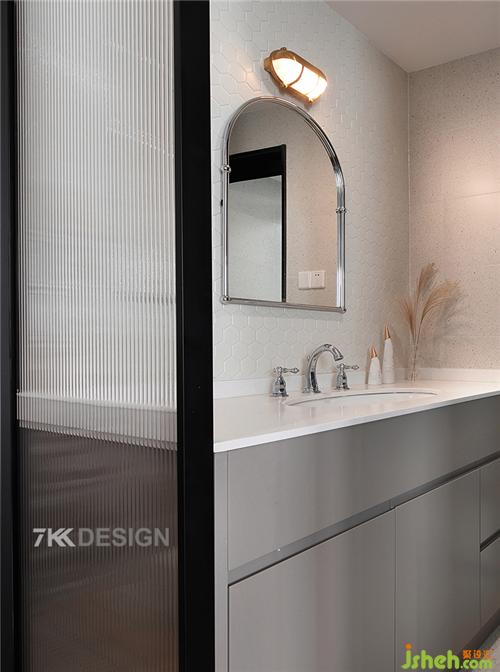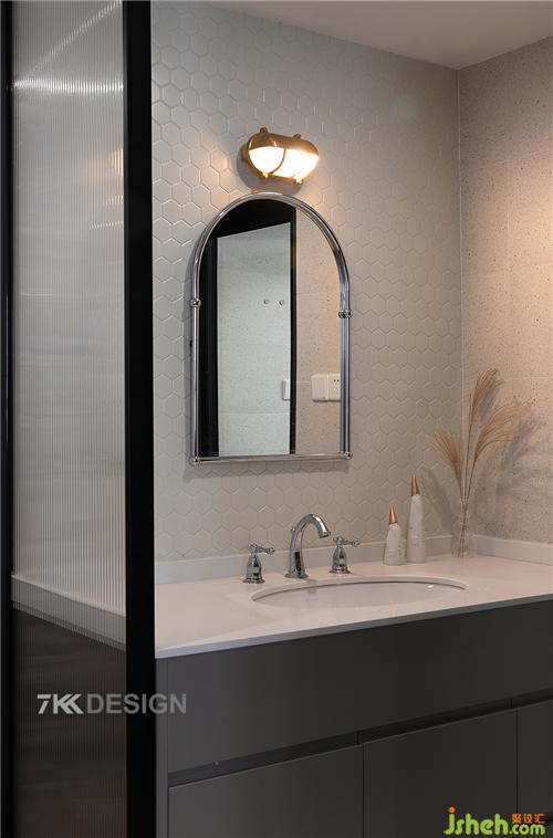 打開燈,衛(wèi)生間干區(qū)的模樣 墻面干凈的馬賽克、半圓拱形浴鏡、黃銅金屬壁燈、灰色儲(chǔ)物柜、各元素的融合給生活帶來驚喜。