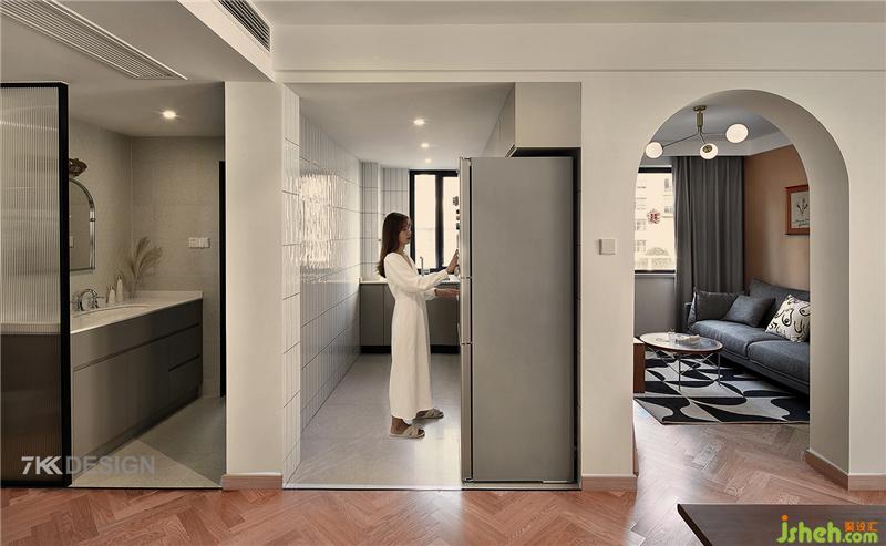 上海裝修設(shè)計(jì)以餐廳為中心,采用圓形拱門,長(zhǎng)方型門洞,連接著客廳、廚房、衛(wèi)生間功能區(qū),數(shù)個(gè)垂直、排列、連接的方式,在走動(dòng)觀賞中,出現(xiàn)延伸般的透視感。門洞開到頂,將較低的層高視野盡可能的拔高,拱形元素增添活潑氣質(zhì)。 因?yàn)橛蜔焼栴},廚房的布局曾在全封、半封、全開之間猶豫,最后還是無法忍受封廚房的擁堵感,采用了全開放的設(shè)計(jì),順便選了吸力強(qiáng)勁的油煙機(jī)。