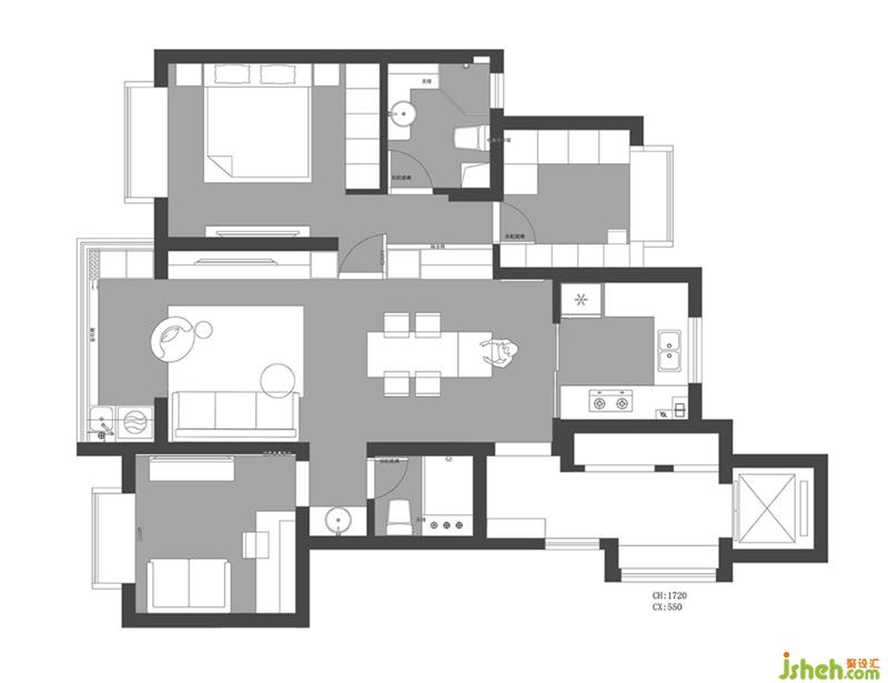 改造后的平面布局圖 秉著平時(shí)只有兩個(gè)人生活的狀態(tài)下,將空間功能達(dá)到舒適理想化的布局,讓家擁有更好的生活體驗(yàn)感。 1、將進(jìn)門(mén)看到的凸出的墻體打掉,利用走廊的空間定制餐邊柜,增加餐廳空間的使用功能。同時(shí)島臺(tái)與餐桌的設(shè)計(jì)也提升家的品質(zhì); 2、廚房移門(mén)設(shè)計(jì),可封閉可開(kāi)放,增加空間視覺(jué)效果和互動(dòng)性,; 3、客廳陽(yáng)臺(tái)作為生活陽(yáng)臺(tái),一邊放置洗衣機(jī)烘干機(jī)+水池,一邊靠墻定制到頂?shù)墓耋w收納使用。陽(yáng)臺(tái)納入室內(nèi)空間,增加視覺(jué)感; 4,、把主衛(wèi)門(mén)改到過(guò)道,重新布局,主臥增加了一排衣柜作為收納; 5、北次臥改成衣帽間結(jié)合梳妝功能,與主臥和主衛(wèi)形成套房模式,全方位提升使用功能,擁有更好的品質(zhì)生活體驗(yàn)。 6、將原始主臥門(mén)改到客廳一側(cè),做成隱形門(mén),與電視柜和餐邊柜齊平,突出整體效果; 7、南次臥做成了多功能房,兼具書(shū)房+影音室+次臥的功能。只需要一張沙發(fā)床,就可以解決,父母或者朋友臨時(shí)居住時(shí),打開(kāi)沙發(fā)床即可。