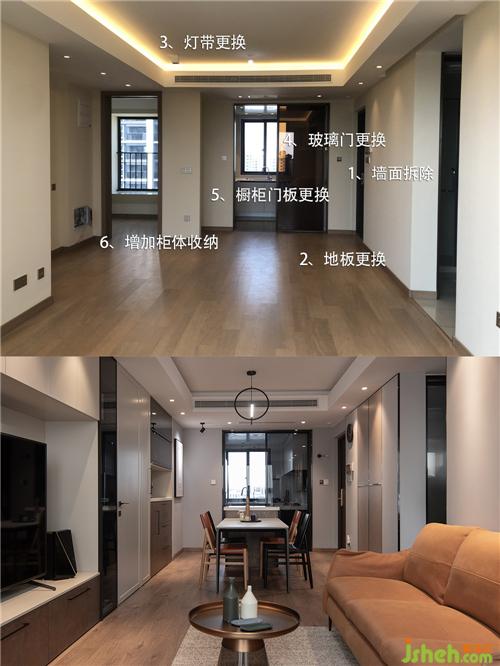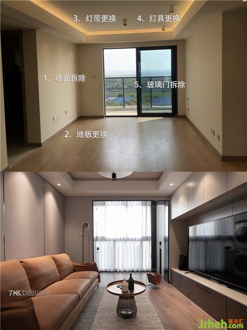 客廳改造前: 1、墻面拆除,沙發(fā)背景墻刷帶帶點(diǎn)灰度的乳膠漆,內(nèi)嵌黑色不銹鋼線條; 2、地板為了符合工業(yè)風(fēng)做舊的元素全部拆除替換; 3、原始燈帶比較偏黃,重新更換燈帶; 4、吊燈燈具更換成主燈,增加空間層次感; 5、陽(yáng)臺(tái)將原始的玻璃門(mén)拆除,陽(yáng)臺(tái)客廳一體空間更寬敞。