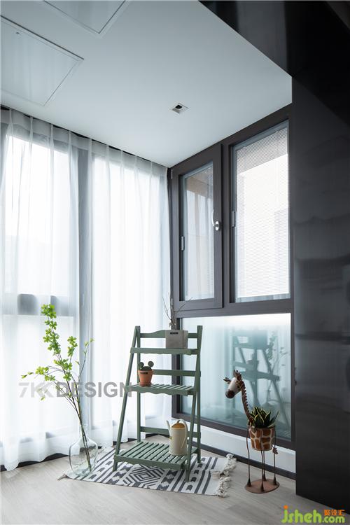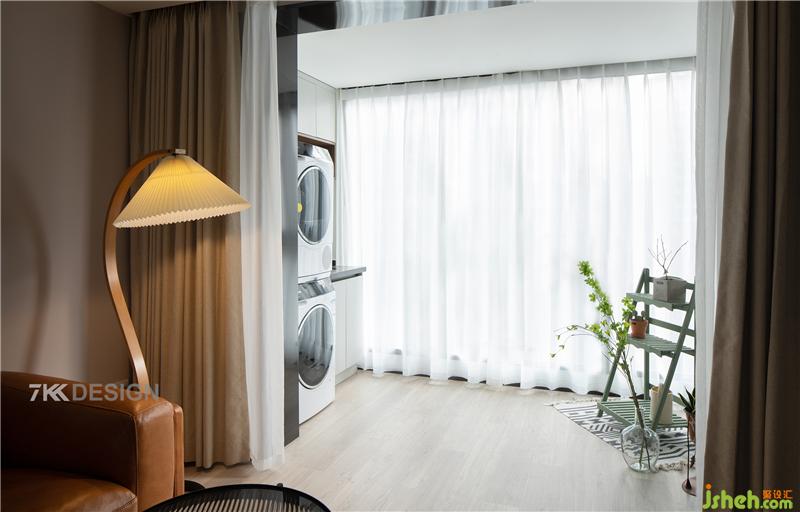 為了保持空間的整體性,地板一直延伸到陽臺,陽臺左側(cè)是功能區(qū),定制的陽臺柜,上下疊放的洗衣機(jī)、烘干機(jī),洗好的衣服直接烘干方便整潔。