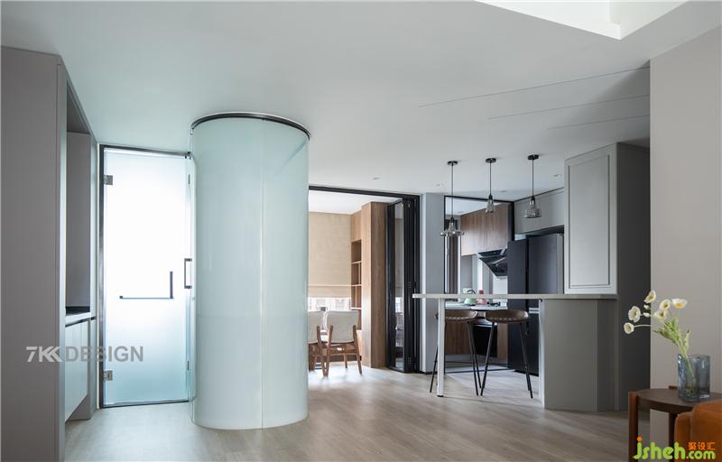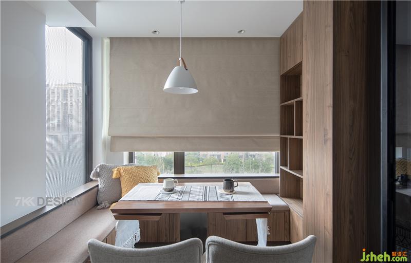 把本北陽臺兩邊的墻體打掉,靠窗設(shè)計成卡座,采光性非常不錯。 卡座對于餐廳來說就像我們經(jīng)常有時候去西餐廳或者營業(yè)場所餐廳去吃飯,總是會去尋找那些靠邊靠墻有卡座的一些區(qū)域坐下,卡座帶給人一種依靠穩(wěn)重安全的感覺,同時卡座本身也具備儲藏的功能,下面空間都可以用來做儲藏,做門板里面可以放多東西,可以拿來使用。 卡座餐廳設(shè)計了折疊門,當(dāng)拉起來的時候,變成一個獨(dú)立的空間,偶爾逢年過節(jié)的時候招待客人也不錯,卡座靠墻一側(cè)打造了整面墻的定制柜,既是日常收納、書柜,展示區(qū),也可做餐邊柜使用。有需要還可以做折疊柜子床,變成一個臨時的客房也不錯。
