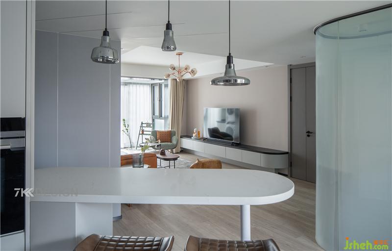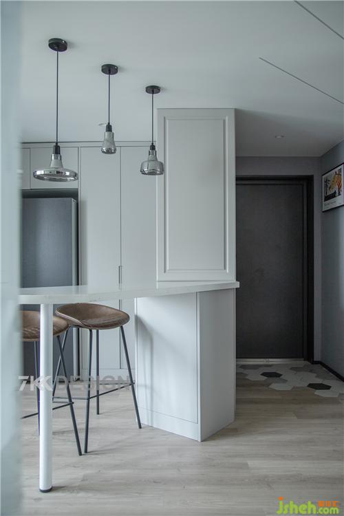 客廳廚房視覺 廚房+吧臺的設(shè)計,可以說是簡易的中西廚布局了; 利用空間的L轉(zhuǎn)角結(jié)構(gòu),定制設(shè)備柜+儲物柜設(shè)計,上海裝修設(shè)計將冰箱、烤箱內(nèi)嵌于柜體,即滿足了強(qiáng)大的儲物需求,又理的利用家的每㎡。而吧臺的設(shè)計讓空間變得實(shí)用又浪漫,它既能充當(dāng)餐桌也可作為西廚使用,又為空間增添了小資情調(diào),不局限于常規(guī)的設(shè)計想法。 吧臺燈光打開的樣子。