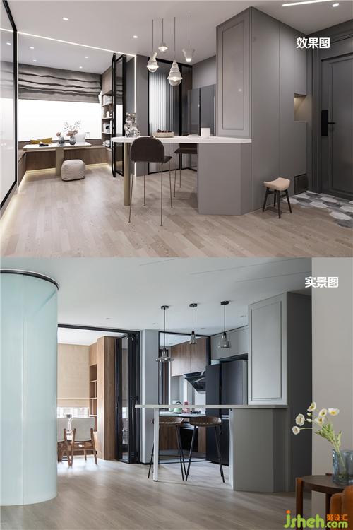 效果圖與實(shí)景圖對比。 原本的廚房拆掉之后,分成了兩個比較迷你的雙廚房,麻雀雖小,五臟俱全。里面是個小的中廚們,雖然小夫妻不怎么做飯,但是他們父母也會偶爾過來給他們做點(diǎn)吃的。