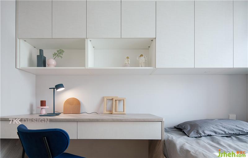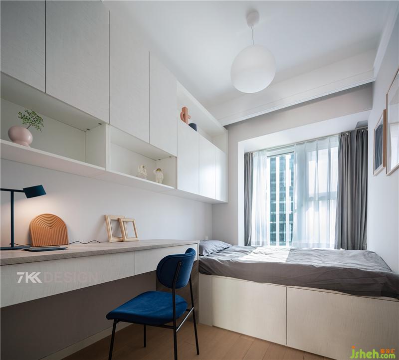 平時(shí)業(yè)主會(huì)在家辦公,最小的房間作為書(shū)房使用并兼具收納的功能,設(shè)計(jì)成榻榻米多功能房間。定制的榻榻米考慮到飄窗的高度,尺寸定制了500mm,和飄窗齊平,集床頭柜和書(shū)柜于一體,將空間利用率最大化上海室內(nèi)設(shè)計(jì)師。