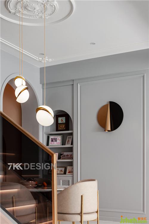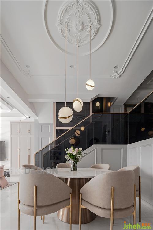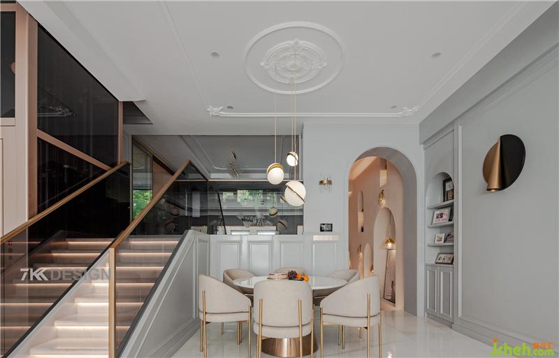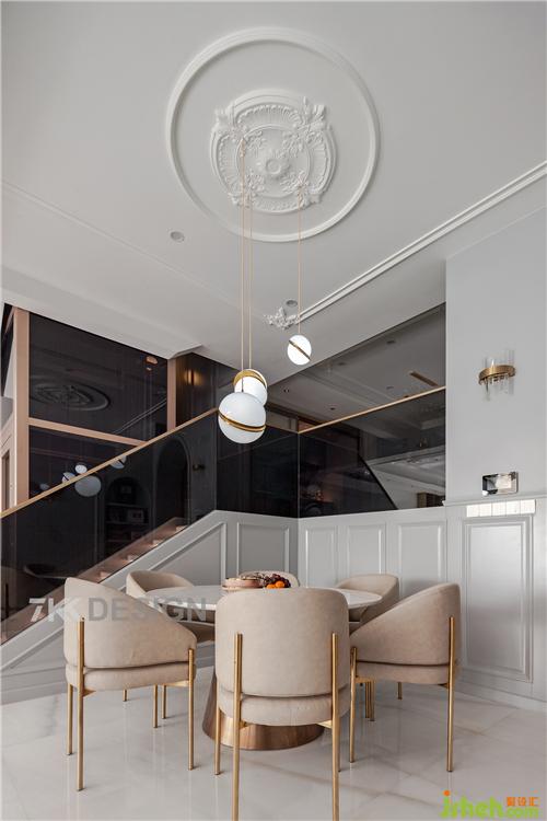 改變原始樓梯騰出中餐廳的位置,吊頂頂部圓形的造型設計與圓形桌子的搭配相呼應。從樓下的空間透過玻璃可以看到樓上的動態(tài)。樓梯扶手也是選擇玻璃材質, 顯的空間輕盈通透。玻璃的隔斷使得樓上樓下隔而不斷,形成很好的互動性。