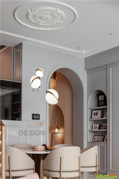 餐廳吊燈選擇錯落簡約的白色半圓球裝飾,為餐廳增添藝術情調氛圍,可以隨意燈光調節(jié)色溫,營造不同的餐廳環(huán)境。