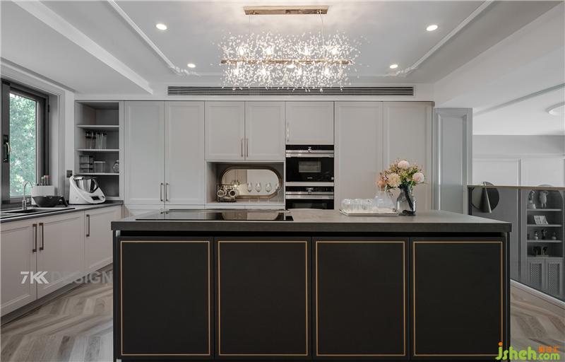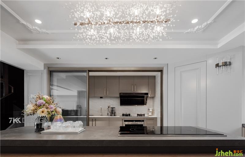西廚加島臺功能區(qū)域,寬敞大氣。原始中廚縮小了空間,設計西廚增加更多的操作功能和儲藏空間。中部島臺加吧臺的設計,提升空間格調,島臺下面還有收納空間,非常實用。上方的藝術吊燈裝飾為空間增加藝術氛圍。正面一側定制到頂?shù)母吖?,里面容納設備柜(雙開門冰箱+烤箱+微波爐)和更多的儲物功能。