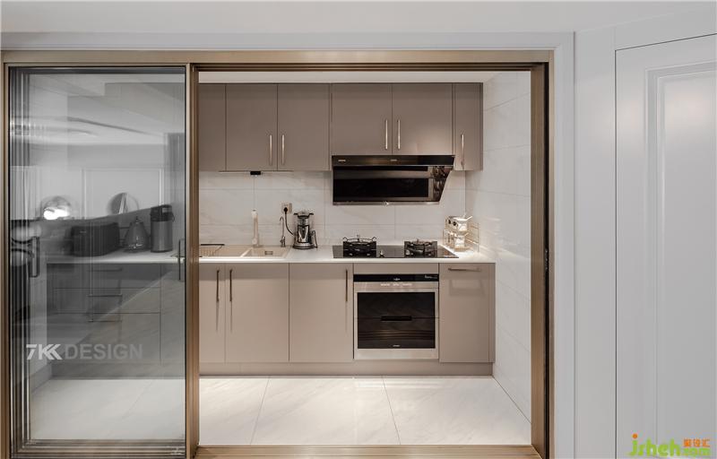 廚房一字型設計,白色地磚拼接,玻璃移門金屬邊框,營造簡潔大氣時尚的烹飪環(huán)境。