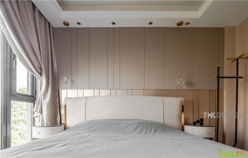 這是三樓的主臥,業(yè)主夫妻的房間,窗戶朝北,原本是選擇朝南的方向,因為風水大師的緣故選擇了這間朝北的臥室。主臥整體選擇大地色系中較淡的顏色為主,賦予臥室靜謐又靈動的氣質,仿佛流淌的詩句般優(yōu)雅。