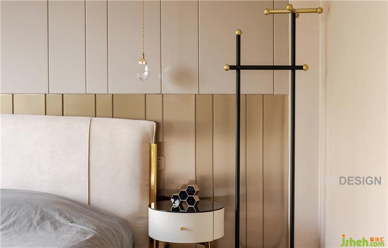 床頭吊柜下面結合豎型的造型拼接,增加線條層次感。圓形簡約床頭柜擺放幾何形拼接的裝飾品,充滿藝術感。旁邊黑色簡約的線條衣架,為臥室擺放衣物增加便利性。