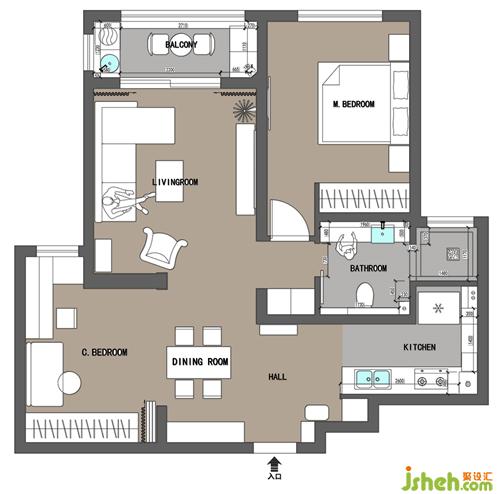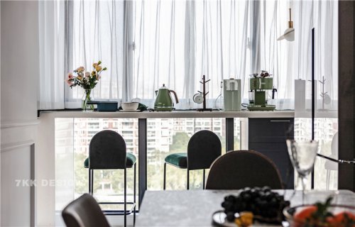 2、廚房做成轉角L開放式空間,這樣進門餐廳空間就比較寬敞,也會增加玄關和餐廳采光,