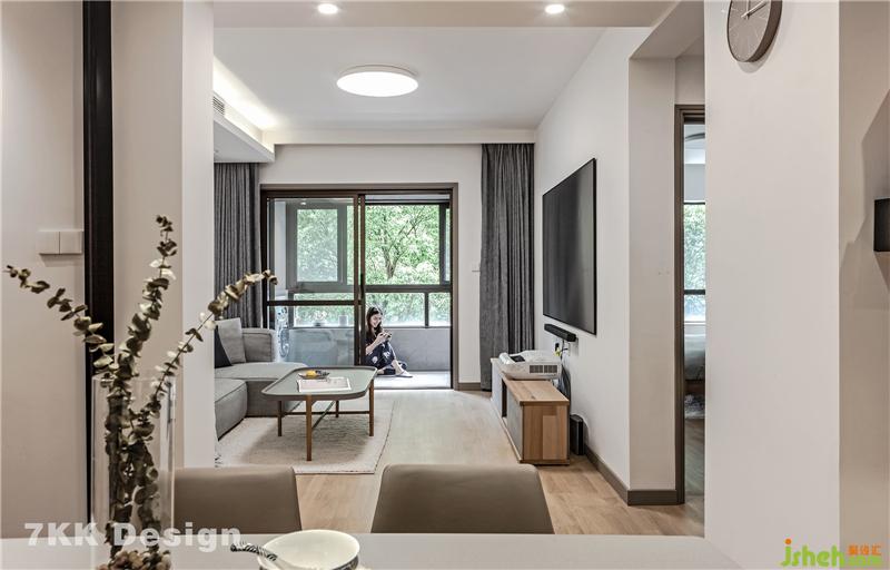 5、客廳墻面設置投影屏幕。陽臺做成洗衣晾曬空間。 改造后整體空間相對開放,空間寬敞明亮,通透性通風性比較好。