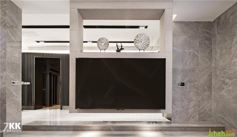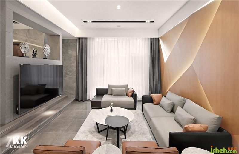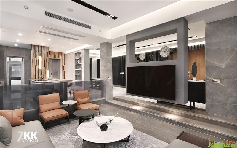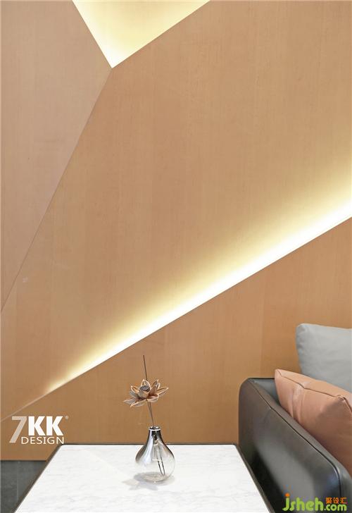 下沉式客廳,將空間的層次感提升。電視墻也是懸掛于頂部垂下,本案多出運用不規(guī)則造型,燈光的結(jié)合,讓整體空間富有強烈設計感。