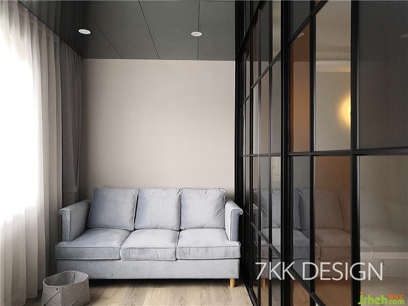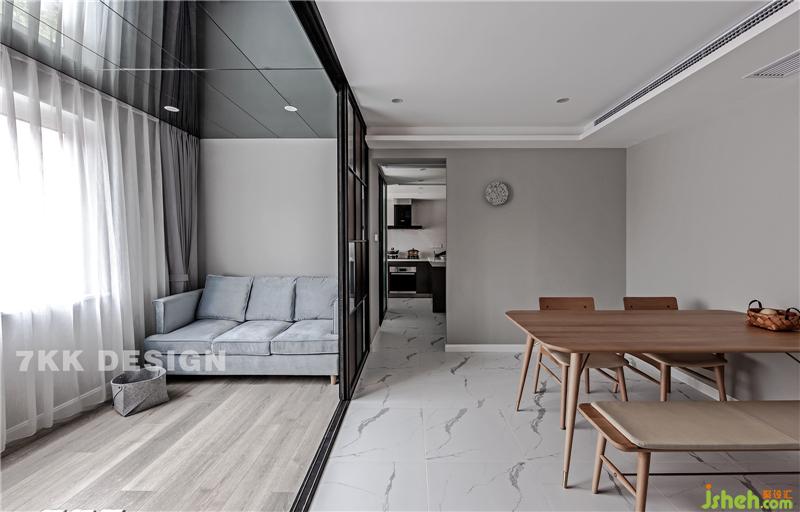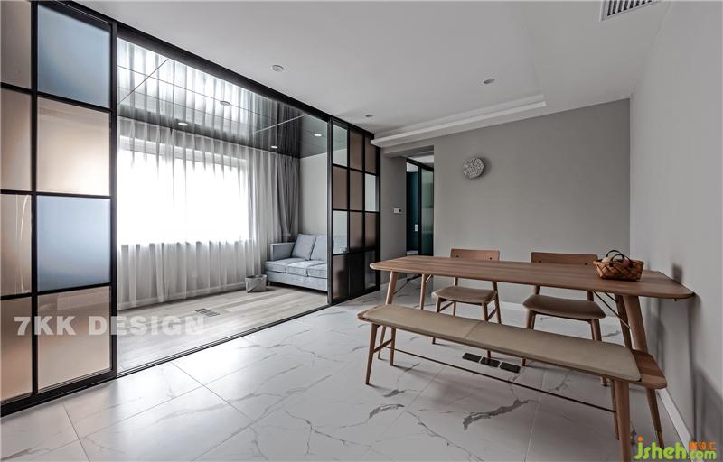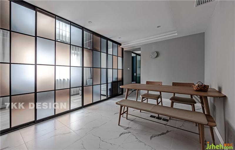 2、利用玻璃隔斷將餐客廳區(qū)分開,利用客廳沙發(fā)后面空間作為辦公空間,玻璃隔斷可獨(dú)立可開放。